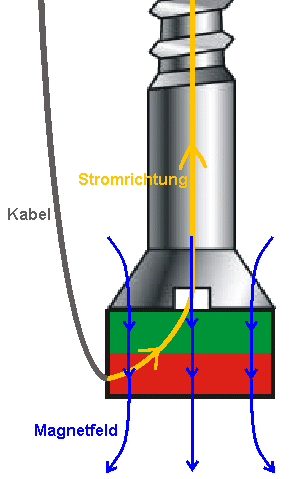 Nun ist noch in orange der mögliche Meg eines Ladungsträgers eingezeichnet. Welche Komponente der Ladungsträgerbewegung ergibt nach der UVW-Regel eine Kraft (Lorentzkraft). In welche Richtung wirkt diese Kraft?